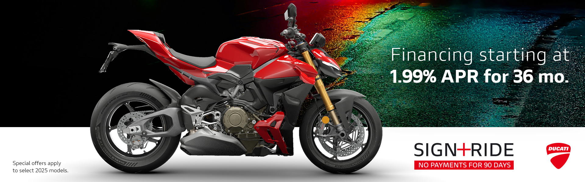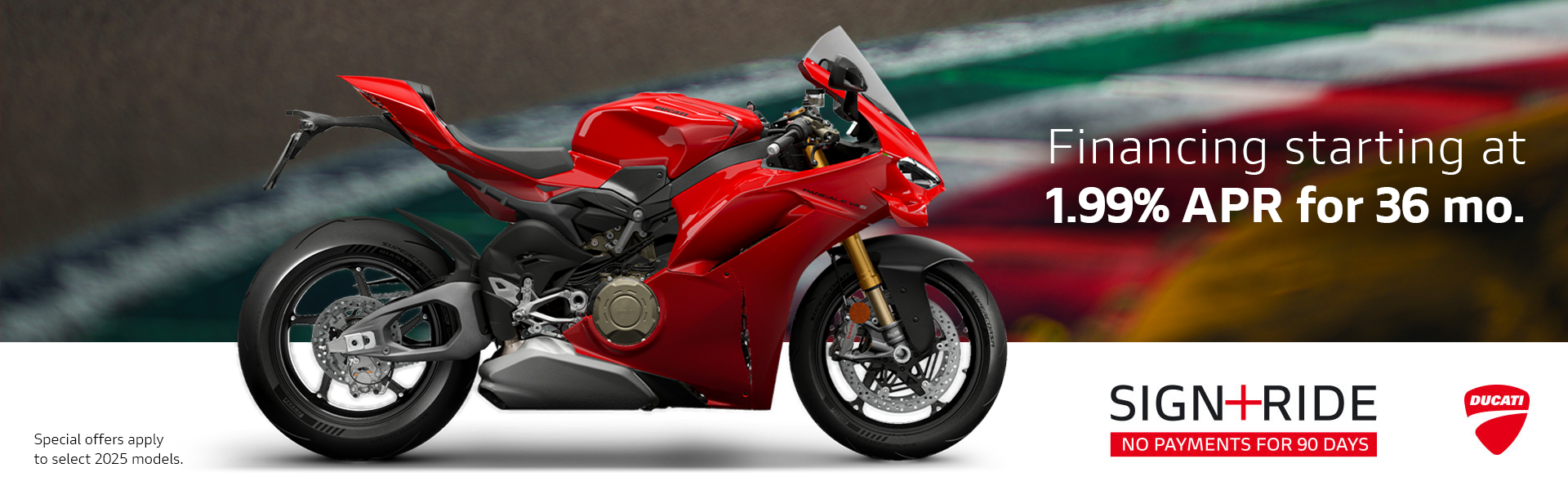 Offer available on select 2025 models to highly qualified customers on approved credit by Ducati Financial Services through participating and authorized Ducati dealers from April 1 - 30, 2026. Down payment requirement varies from 0%-25% of the purchase price based on credit worthiness. Not all customers will qualify for the advertised APR. Minimum amount financed is $5,000. See your local Ducati dealer for financing details or, for general product information, call 1-888-391-5446. VW Credit, Inc. dba Ducati Financial Services is a servicer for VCI Loan Services, LLC. © 2026 Ducati North America.